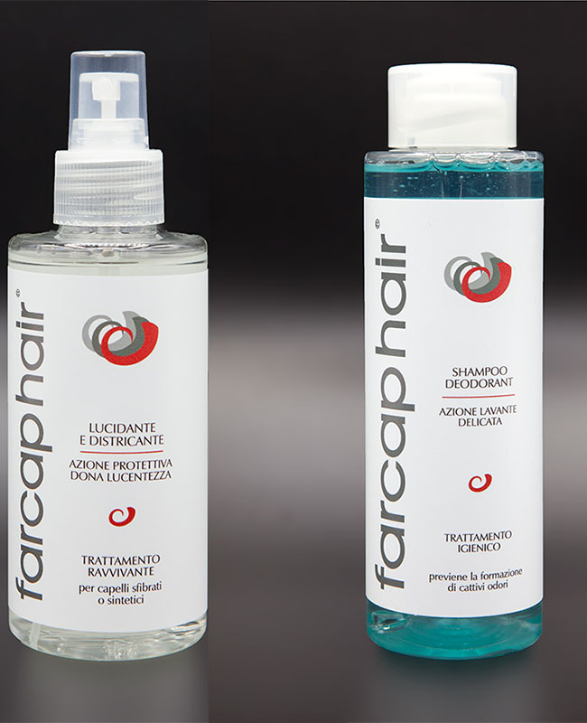 Il Kit manutenzione per parrucca sintetica è composto dallo Shampoo deodorante e dal lucidante districante.