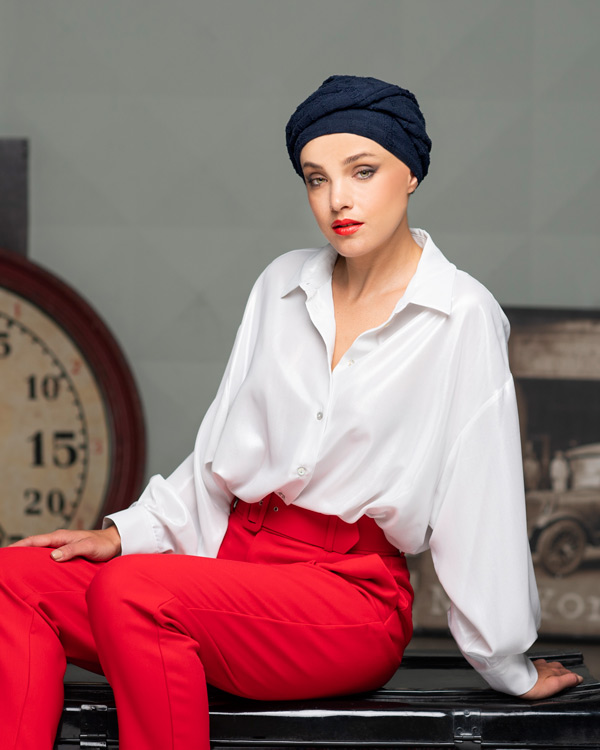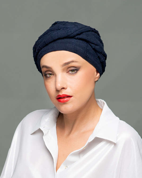 Turbante in lana blu. Estremamente morbido, caldo e confortevole. Il blu scuro tinta unita è spezzato dalla fantasia della lavorazione. A contatto con la pelle della delicata fibra 100% bamboo.