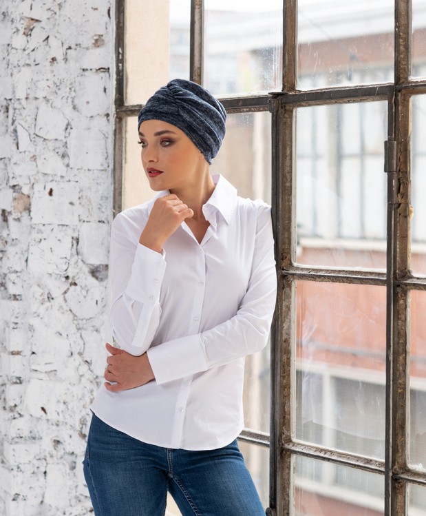 Turbante drappeggiato sul davanti color blu scuro melange. Soffice e morbido,delicato sulla pelle, ideale da indossare sia all’aperto che in luoghi chiusi.