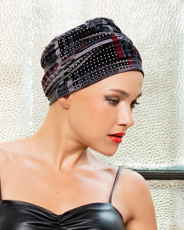 Turbante in cotone nero e bianco con un tocco di rosso e di blu. Con un abitino o in jeans e maglietta, per tutti i gusti e tutte le età. Comodissimo, morbido sulla pelle con il suo interno in bamboo.