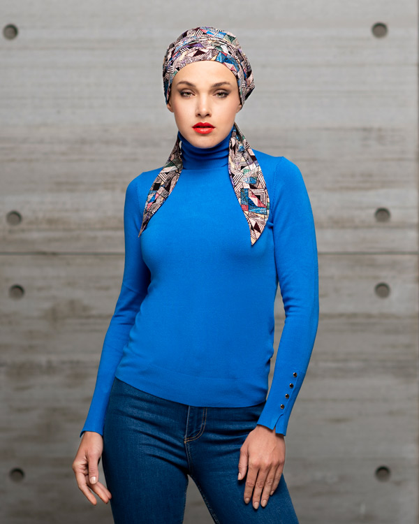 Turbante a bande lunghe con fantasia geometrica. Ricco di colore, questo turbante molto versatile può essere indossato in diverse modalità. La parte di seta nel filato la rende piacevole al tatto. All’interno 100% cotone.